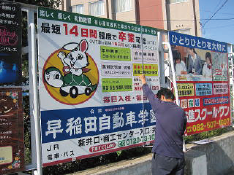 屋外・屋内広告、横断幕、懸垂幕、ポスター、車両ラッピング、タペストリーなどインクジェット出力による広告物が多様化されています。デザインを元に製作していきます。屋外の場合は特に耐久性の良い材質を重視して製作します。弊社はインクジェット出力を高品質・短納期・低価格化に取り組んでいます。