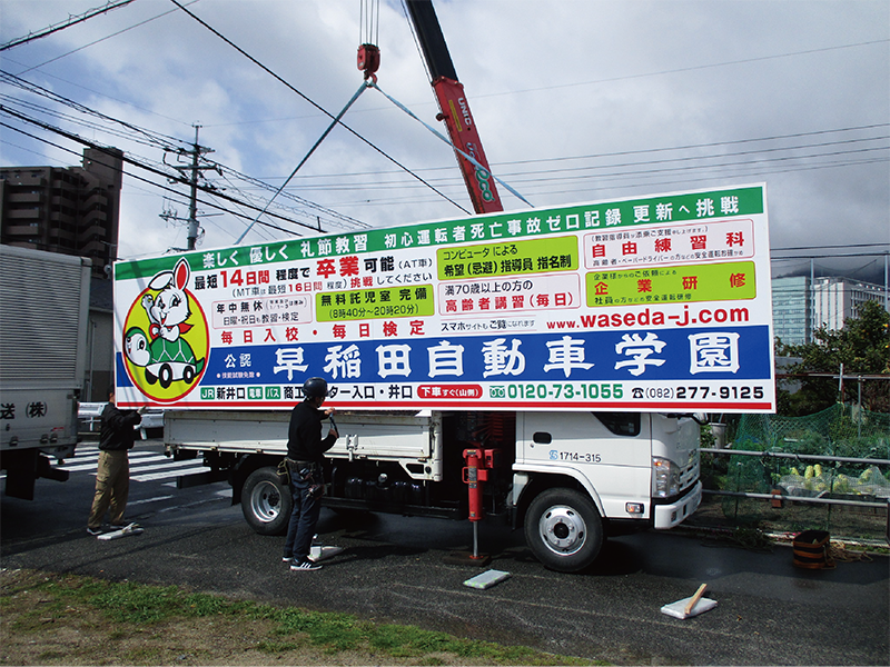 完成した看板を取付します。取付作業は「安全かつ確実に」を徹底して作業しています。特に車両・歩行者・近隣の方にご迷惑をお掛けしないよう施工前に職人同士でミーティングを行い施工します。弊社では現場施工に積極的に取り組んでいます。弊社の精鋭の職人が責任を持って施工します。
